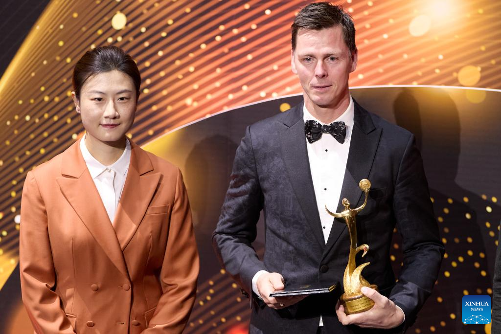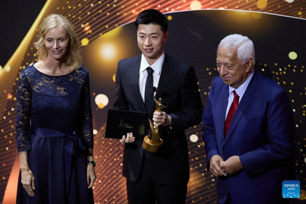 CASCAIS, 31 octubre, 2024 (Xinhua) -- Imagen del 30 de octubre de 2024 del ícono del tenis de mesa chino, Ma Long (c), recibiendo el premio ANOC a la Trayectoria Deportiva Destacada durante la ceremonia de entrega de premios de la Asociación de Comités Olímpicos Nacionales (ANOC, por sus siglas en inglés) 2024, en Cascais, Portugal. (Xinhua/Meng Dingbo)