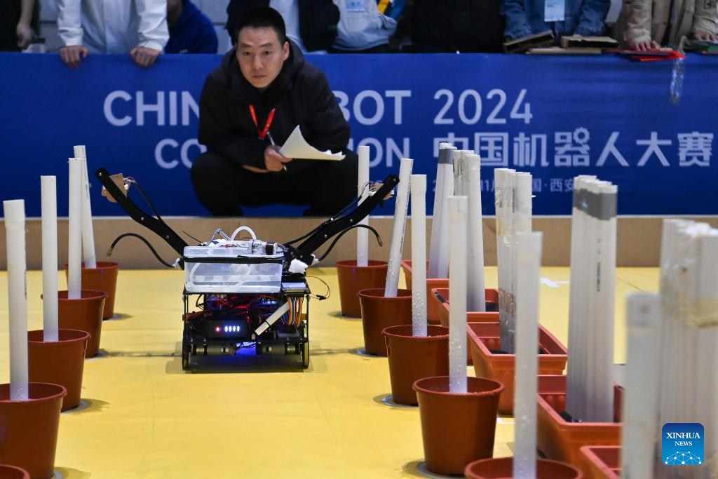XI'AN, 1 noviembre, 2024 (Xinhua) -- Un robot de riego participa durante la Competencia de Robots de China, en Xi'an, en la provincia de Shaanxi, en el noroeste de China, el 1 de noviembre de 2024. La Competencia de Robots de China 2024 comenzó aquí el viernes. Más de 1.700 equipos de más de 200 universidades participaron en esta competencia. (Xinhua/Zou Jingyi)