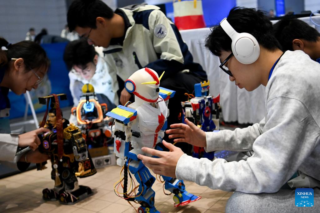 XI'AN, 1 noviembre, 2024 (Xinhua) -- Participantes trabajan en sus robots durante la Competencia de Robots de China, en Xi'an, en la provincia de Shaanxi, en el noroeste de China, el 1 de noviembre de 2024. La Competencia de Robots de China 2024 comenzó aquí el viernes. Más de 1.700 equipos de más de 200 universidades participaron en esta competencia. (Xinhua/Zou Jingyi)