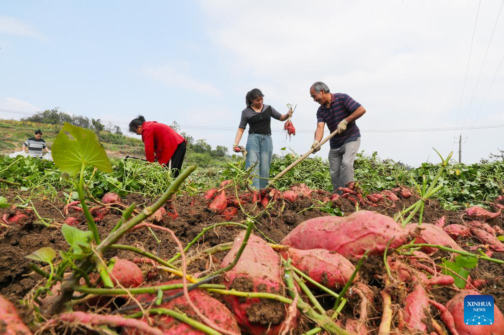 BEIJING, 2 noviembre, 2024 (Xinhua) -- Imagen del 1 de noviembre de 2024 de agricultores cosechando batatas, en el poblado de Jiantou del distrito de Xintian, en la provincia de Hunan, en el centro de China. (Xinhua/Liu Guixiong)