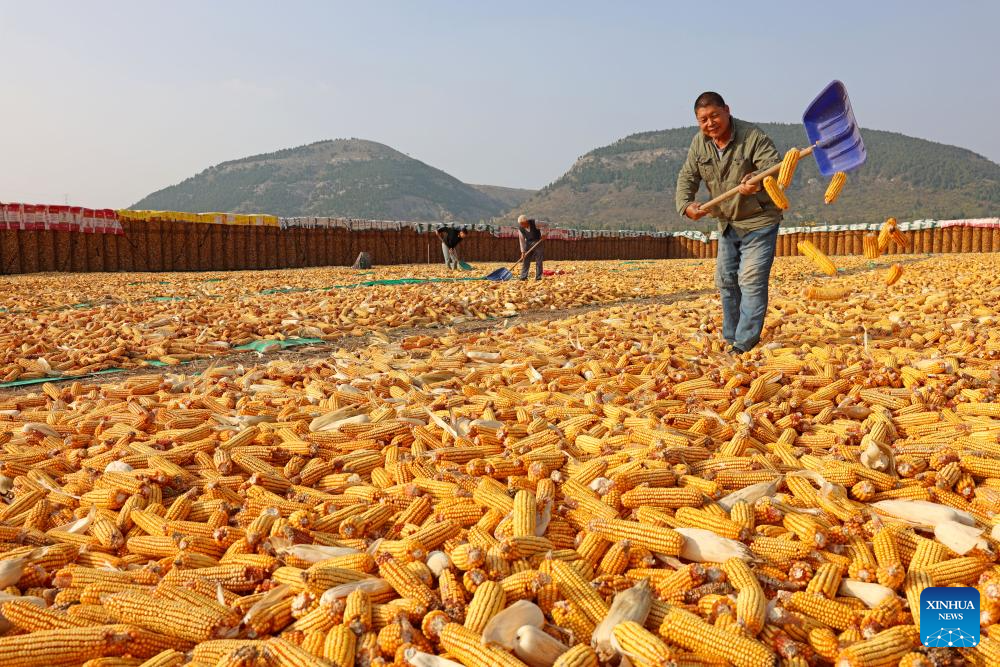 BEIJING, 2 noviembre, 2024 (Xinhua) -- Imagen del 1 de noviembre de 2024 de agricultores aireando maíz, en la ciudad de Zaozhuang, en la provincia de Shandong, en el este de China. (Xinhua/Sun Zhongzhe)