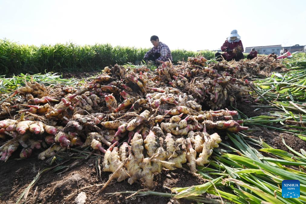 BEIJING, 2 noviembre, 2024 (Xinhua) -- Imagen del 1 de noviembre de 2024 de agricultores cosechando jengibre, en la aldea de Mazhuang del poblado de Shanwangzhuang, en Qinyang, en la provincia de Henan, en el centro de China. (Xinhua/Yang Fan)