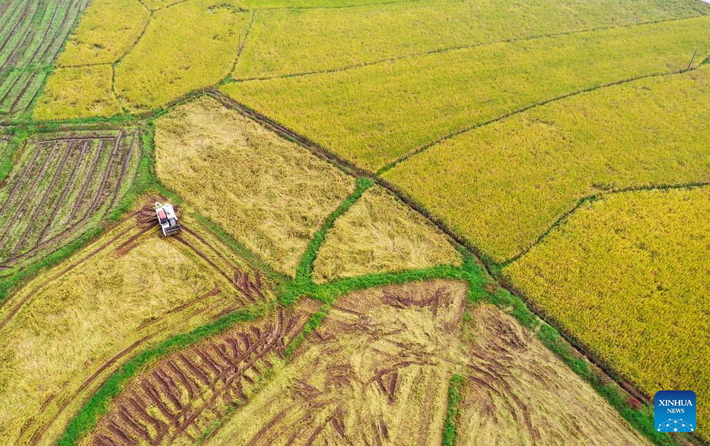 BEIJING, 2 noviembre, 2024 (Xinhua) -- Imagen aérea tomada con un dron el 2 de noviembre de 2024 de una cosechadora trabajando en un campo de arroz, en la aldea de Jingtang, en Zixing, en la provincia de Hunan, en el centro de China. (Xinhua/Li Ke)