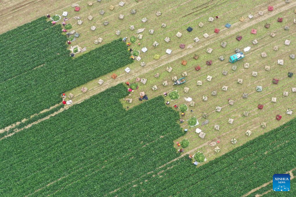 BEIJING, 2 noviembre, 2024 (Xinhua) -- Imagen aérea tomada con un dron el 2 de noviembre de 2024 de agricultores cosechando espinacas, en el poblado de Jiangzhuang de Gaomi, en la provincia de Shandong, en el este de China. (Xinhua/Li Haitao)