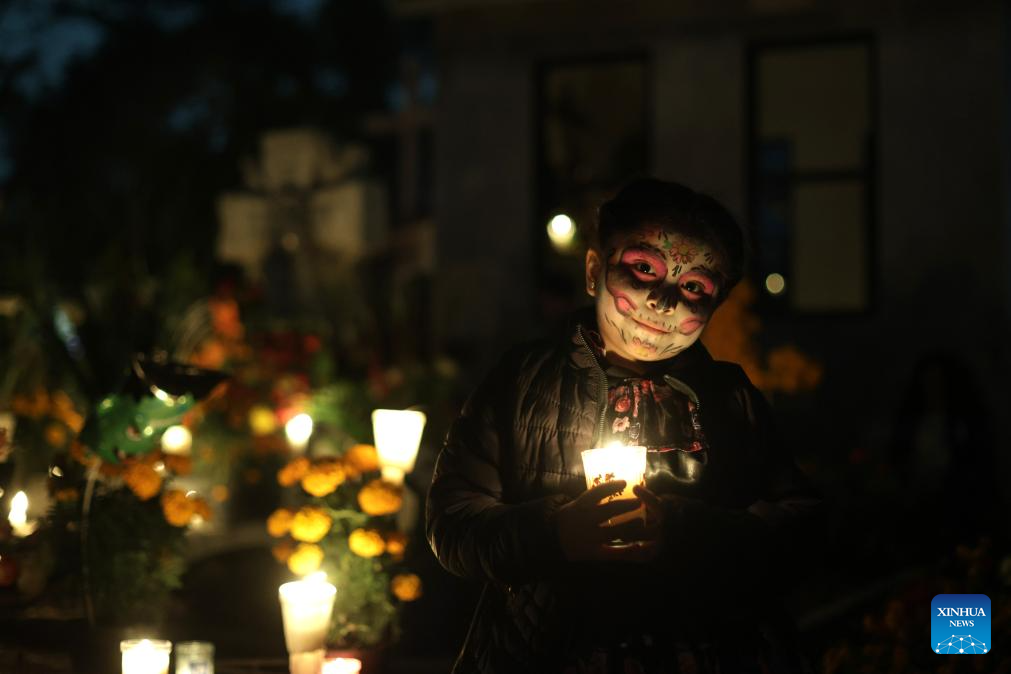 CIUDAD DE MEXICO, 2 noviembre, 2024 (Xinhua) -- Imagen del 1 de noviembre de 2024 de una niña con maquillaje participando en una velada en el marco de la celebración del Día de Muertos en el panteón de San Gregorio, en la Ciudad de México, capital de México. (Xinhua/Francisco Cañedo)