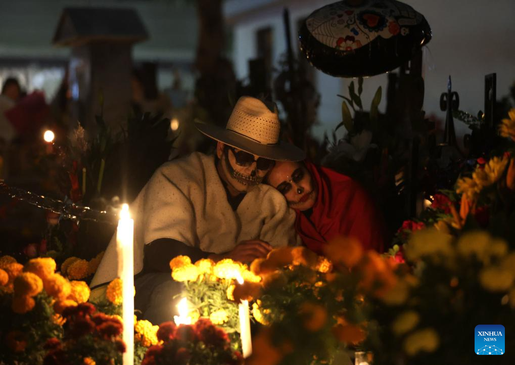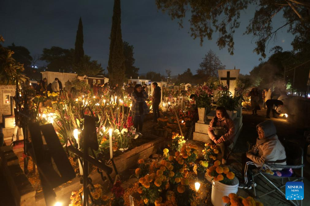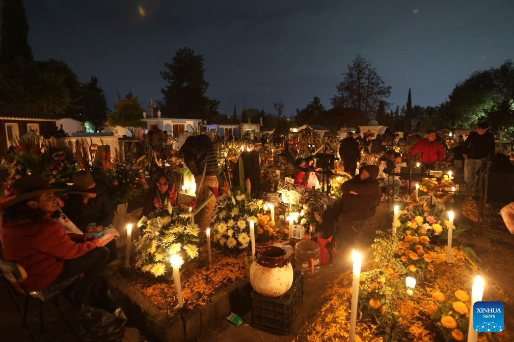 CIUDAD DE MEXICO, 2 noviembre, 2024 (Xinhua) -- Imagen del 1 de noviembre de 2024 de personas participando en una velada en el marco de la celebración del Día de Muertos en el panteón de San Gregorio, en la Ciudad de México, capital de México. (Xinhua/Francisco Cañedo)