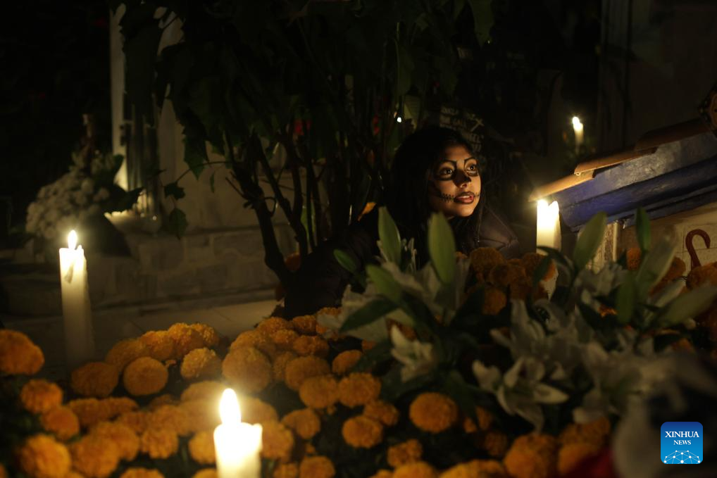 CIUDAD DE MEXICO, 2 noviembre, 2024 (Xinhua) -- Imagen del 1 de noviembre de 2024 de una mujer participando en una velada en el marco de la celebración del Día de Muertos en el panteón de San Gregorio, en la Ciudad de México, capital de México. (Xinhua/Francisco Cañedo)