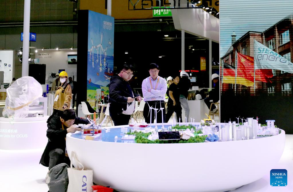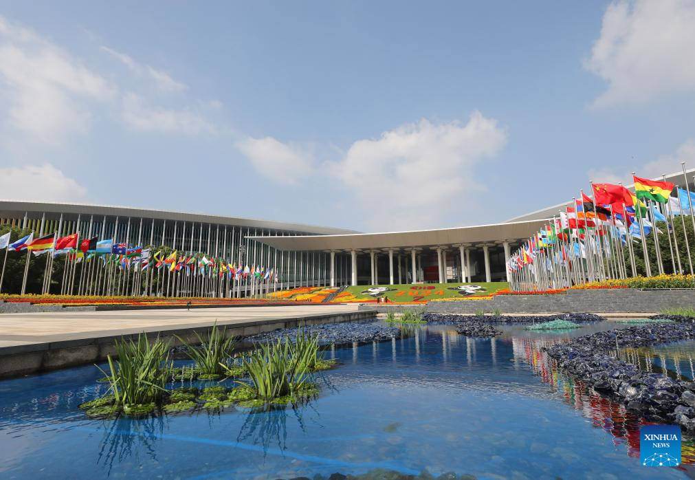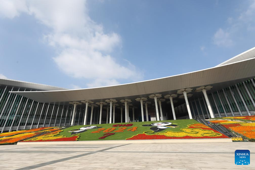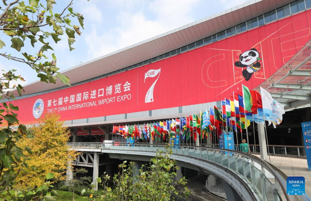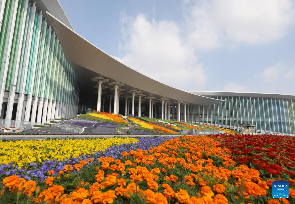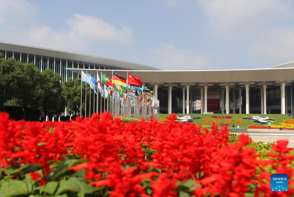 SHANGHAI, 2 noviembre, 2024 (Xinhua) -- Imagen del 2 de noviembre de 2024 de la plaza sur del Centro Nacional de Exposiciones y Convenciones (Shanghai), la sede principal de la VII Exposición Internacional de Importaciones de China (CIIE, siglas en inglés), en Shanghai, en el este de China. Los preparativos para la VII CIIE están casi terminados y el evento se celebrará del 5 al 10 de noviembre en Shanghai. (Xinhua/Fang Zhe)