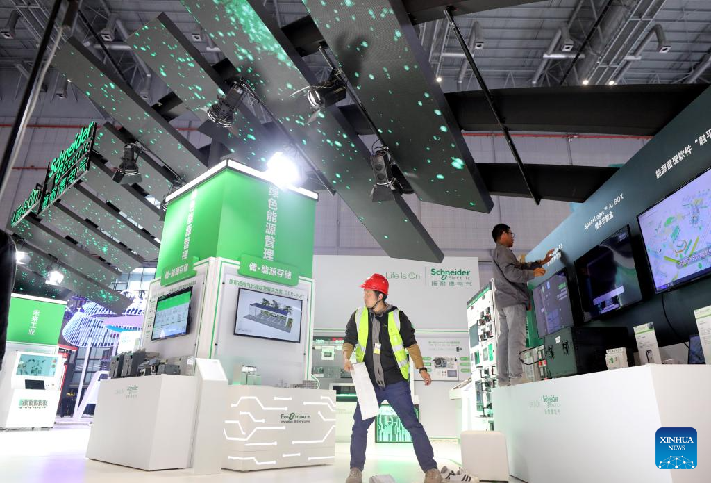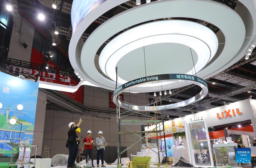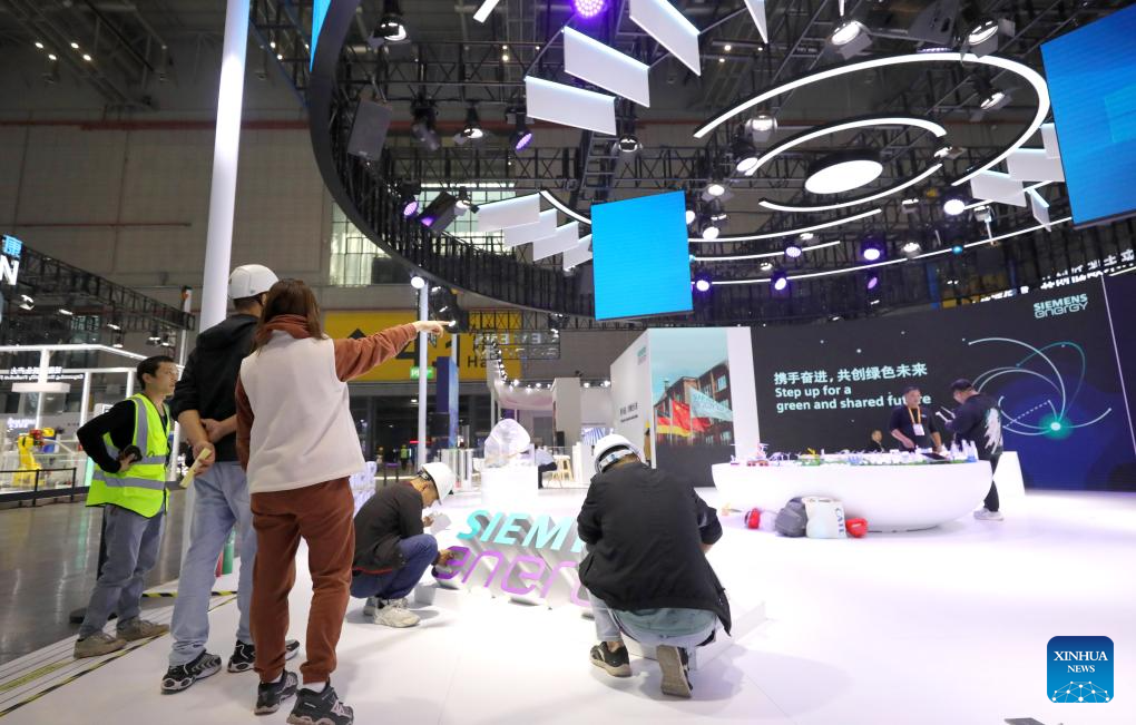 SHANGHAI, 2 noviembre, 2024 (Xinhua) -- Trabajadores instalan estands de exhibición para la próxima VII Exposición Internacional de Importaciones de China (CIIE, siglas en inglés) en el Centro Nacional de Exposiciones y Convenciones (Shanghai), la sede principal de la CIIE, en Shanghai, en el este de China, el 2 de noviembre de 2024. Los preparativos para la VII CIIE están casi terminados y el evento se celebrará del 5 al 10 de noviembre en Shanghai. (Xinhua/Fang Zhe)
