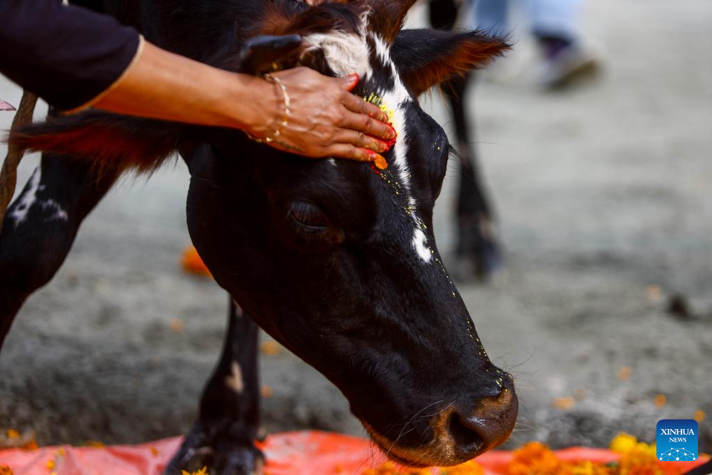 LALITPUR, 2 noviembre, 2024 (Xinhua) -- Vacas son adoradas durante el Tihar, también conocido como el festival de las luces, en Lalitpur, Nepal, el 2 de noviembre de 2024. (Xinhua/Sulav Shrestha)