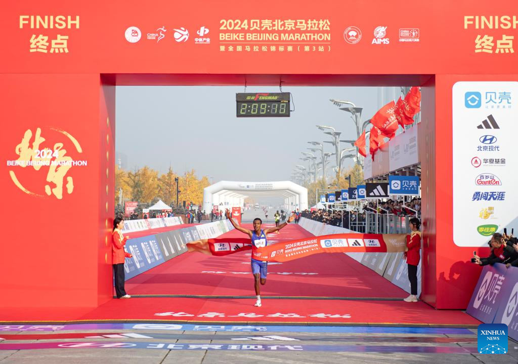 BEIJING, 3 noviembre, 2024 (Xinhua) -- Lemi Berhanu Hayle, de Etiopía, cruza la línea de meta durante el Maratón de Beijing 2024, en Beijing, capital de China, el 3 de noviembre de 2024. (Xinhua/Chen Zhonghao)