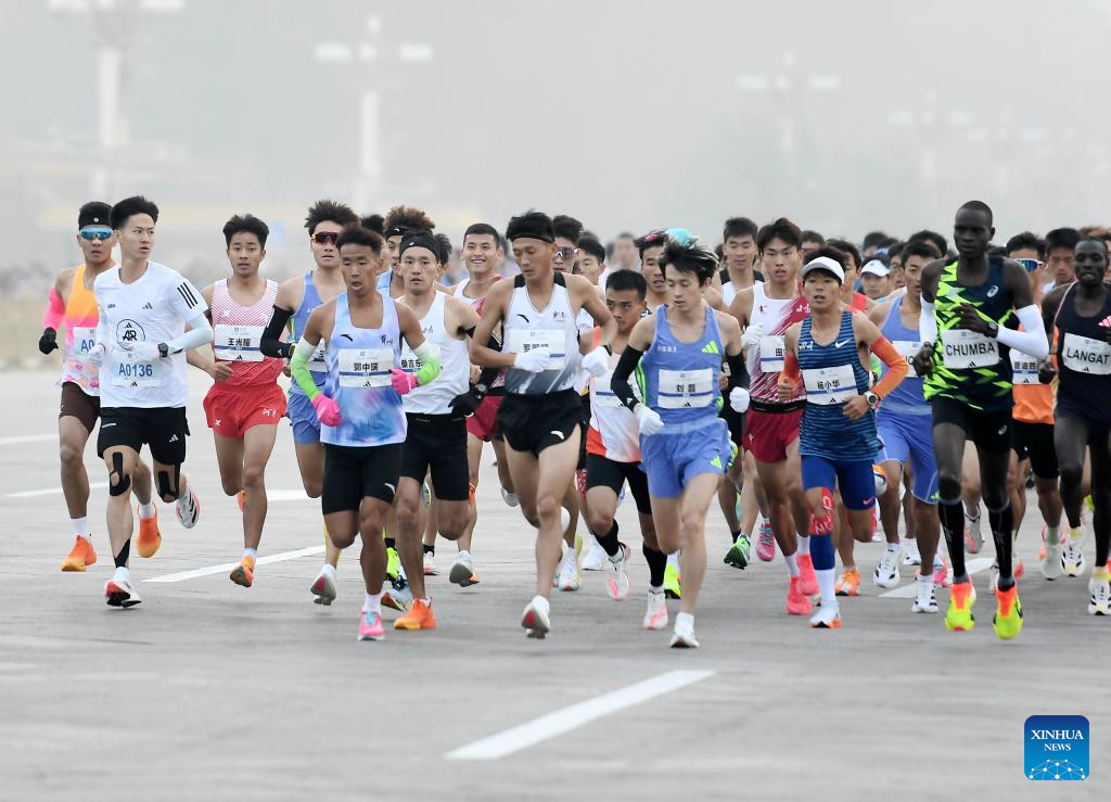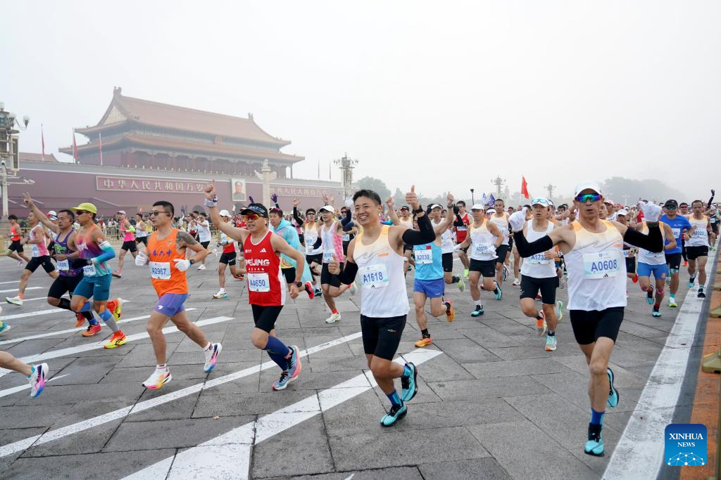 BEIJING, 3 noviembre, 2024 (Xinhua) -- Participantes corren frente a la Plaza de Tian'anmen durante el Maratón de Beijing 2024, en Beijing, capital de China, el 3 de noviembre de 2024. (Xinhua/Zhang Chenlin)