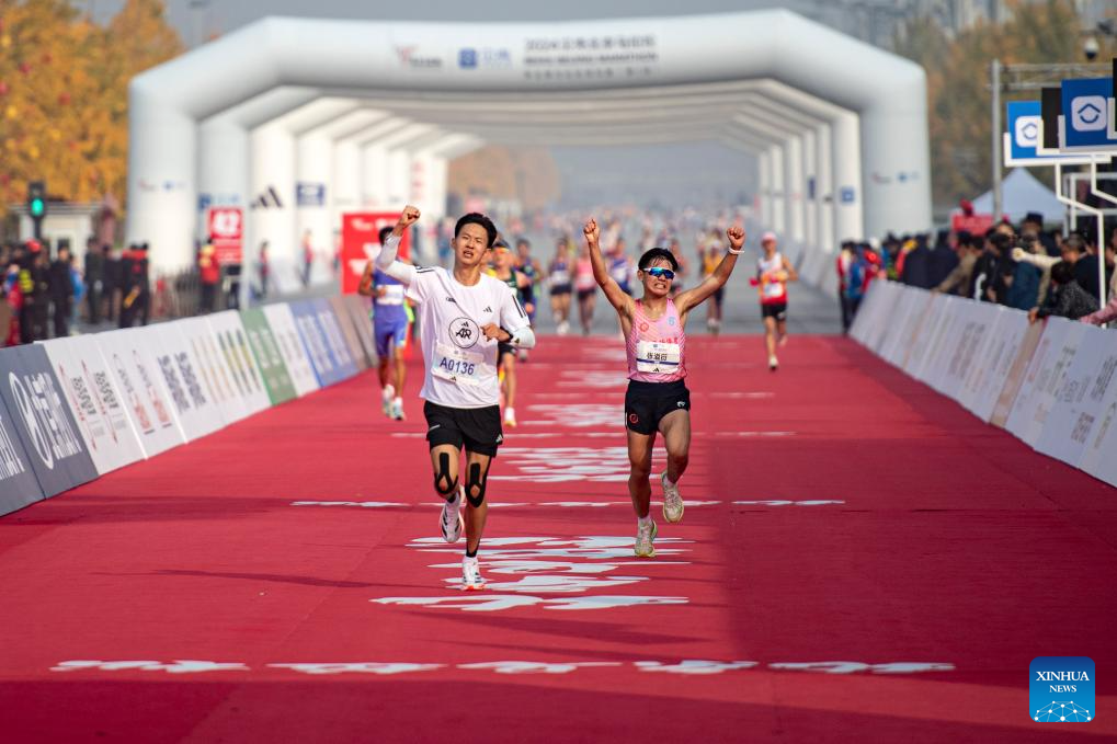 BEIJING, 3 noviembre, 2024 (Xinhua) -- Participantes corren a la línea de meta durante el Maratón de Beijing 2024, en Beijing, capital de China, el 3 de noviembre de 2024. (Xinhua/Chen Zhonghao)