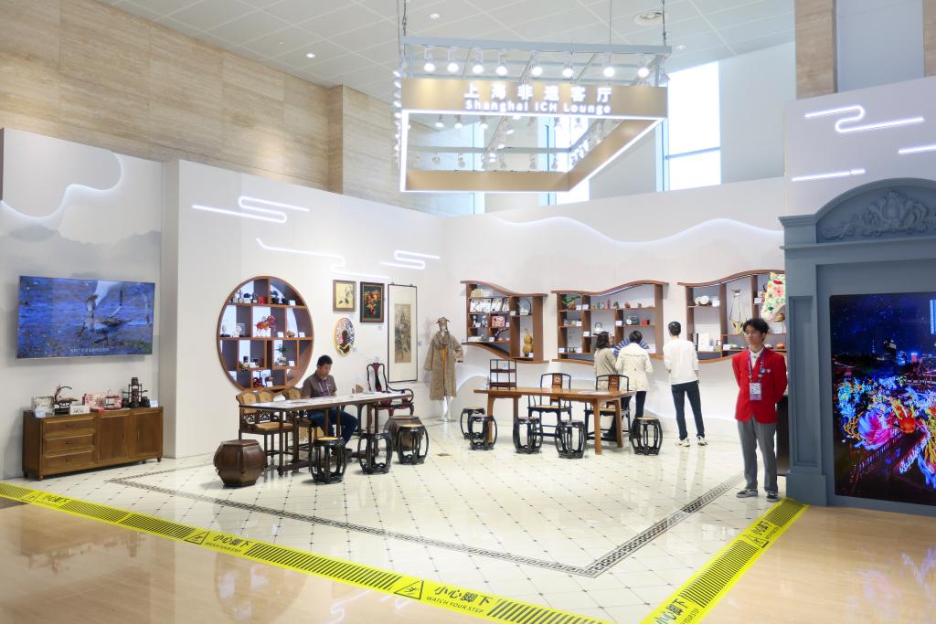 SHANGHAI, 3 noviembre, 2024 (Xinhua) -- Imagen del 3 de noviembre de 2024 del área de exposiciones para patrimonios culturales inmateriales de Shanghai en el centro de medios de la VII Exposición Internacional de Importaciones de China (CIIE, por sus siglas en inglés) en el Centro Nacional de Exposiciones y Convenciones (Shanghai), en Shanghai, en el este de China. El centro de medios de la VII CIIE abrió el domingo para proveer servicios para periodistas. (Xinhua/Wang Xiang)