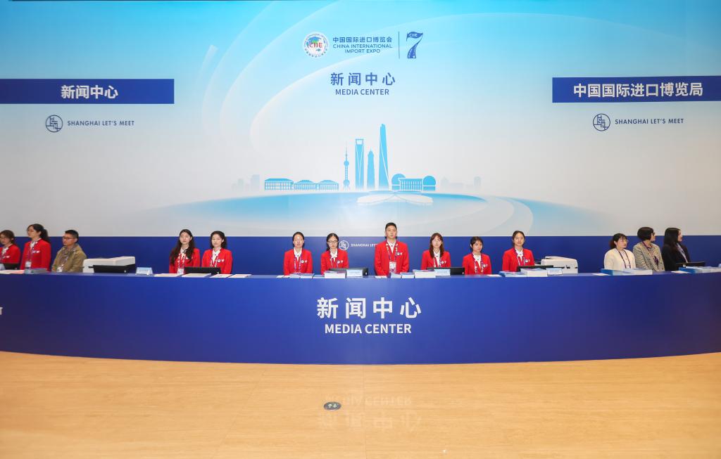 SHANGHAI, 3 noviembre, 2024 (Xinhua) -- Imagen del 3 de noviembre de 2024 del mostrador de información en el centro de medios de la VII Exposición Internacional de Importaciones de China (CIIE, por sus siglas en inglés) en el Centro Nacional de Exposiciones y Convenciones (Shanghai), en Shanghai, en el este de China. El centro de medios de la VII CIIE se abrió el domingo para proveer servicios a periodistas. (Xinhua/Wang Xiang)