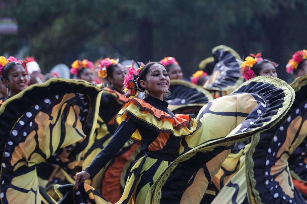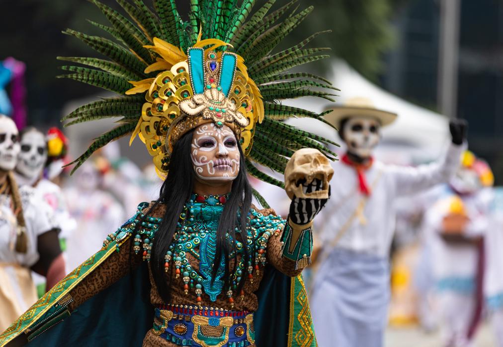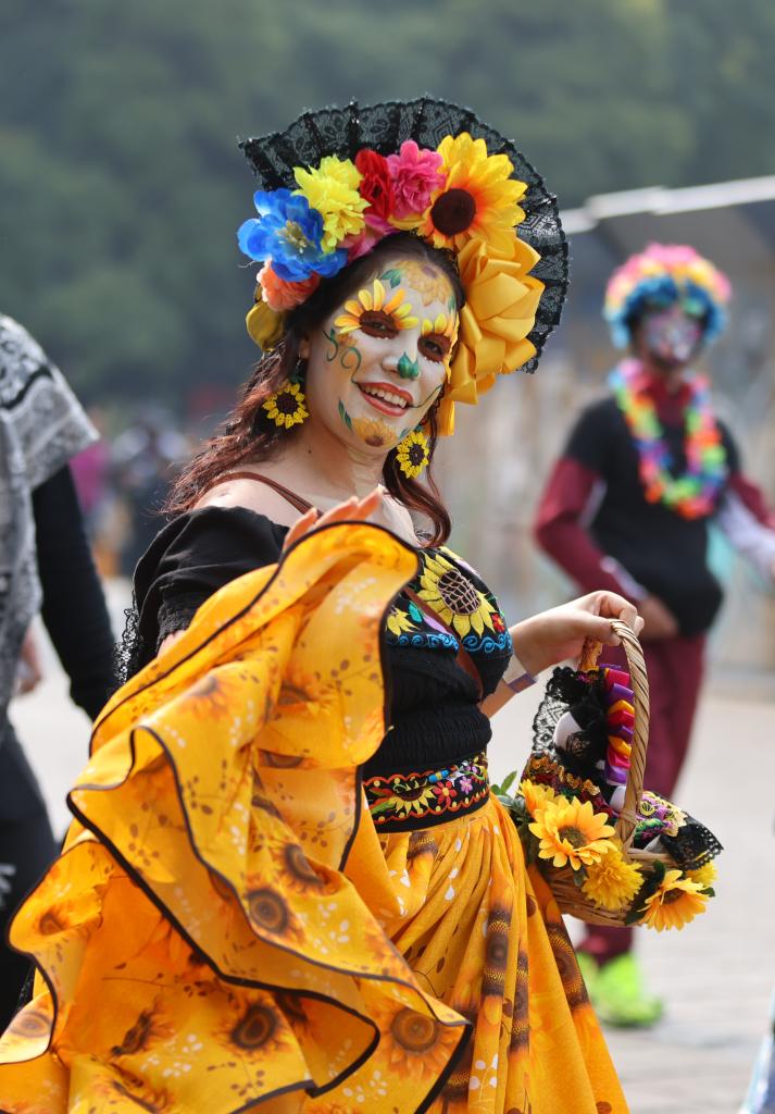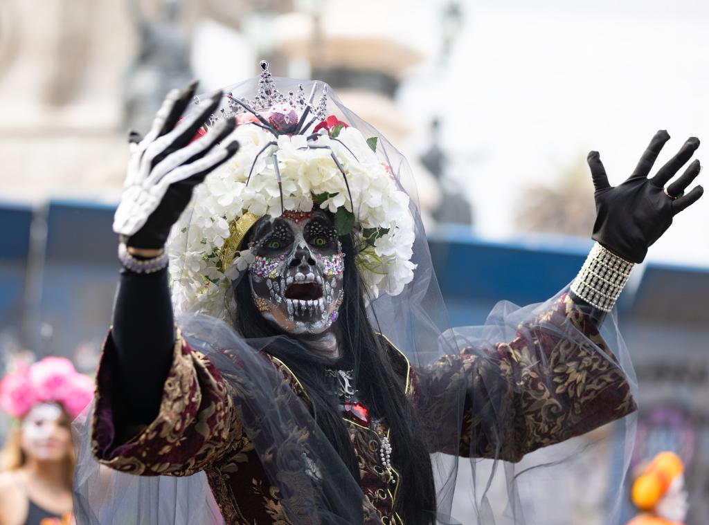 CIUDAD DE MÉXICO, 3 noviembre, 2024 (Xinhua) -- Imagen del 2 de noviembre de 2024 de una mujer portando un disfraz mientras participa en el Desfile del Día de Muertos, en el centro de la Ciudad de México, capital de México. (Xinhua/Li Mengxin)