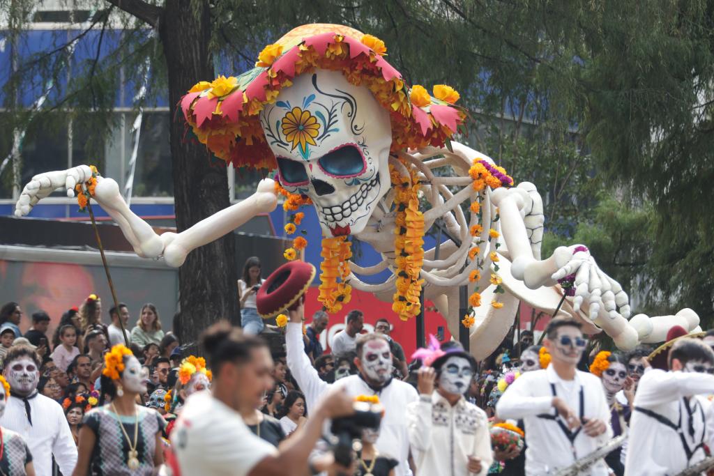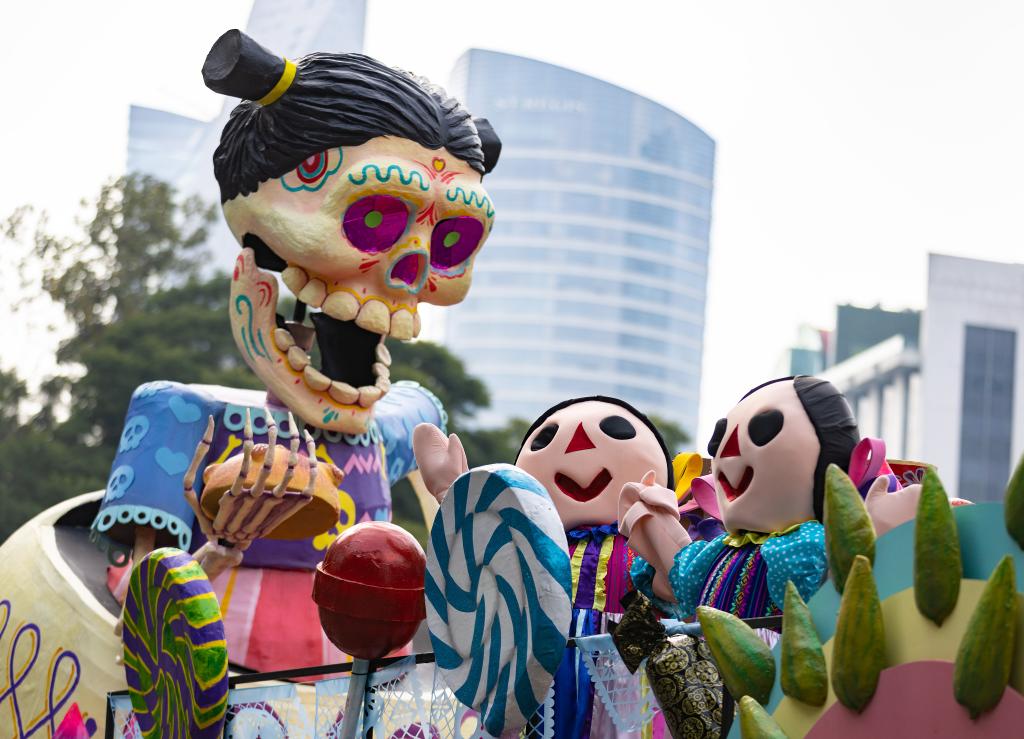 (241103) -- CIUDAD DE MÉXICO, 3 noviembre, 2024 (Xinhua) -- Imagen del 2 de noviembre de 2024 de instalaciones artísticas durante el Desfile del Día de Muertos, en el centro de la Ciudad de México, capital de México. (Xinhua/Li Mengxin)