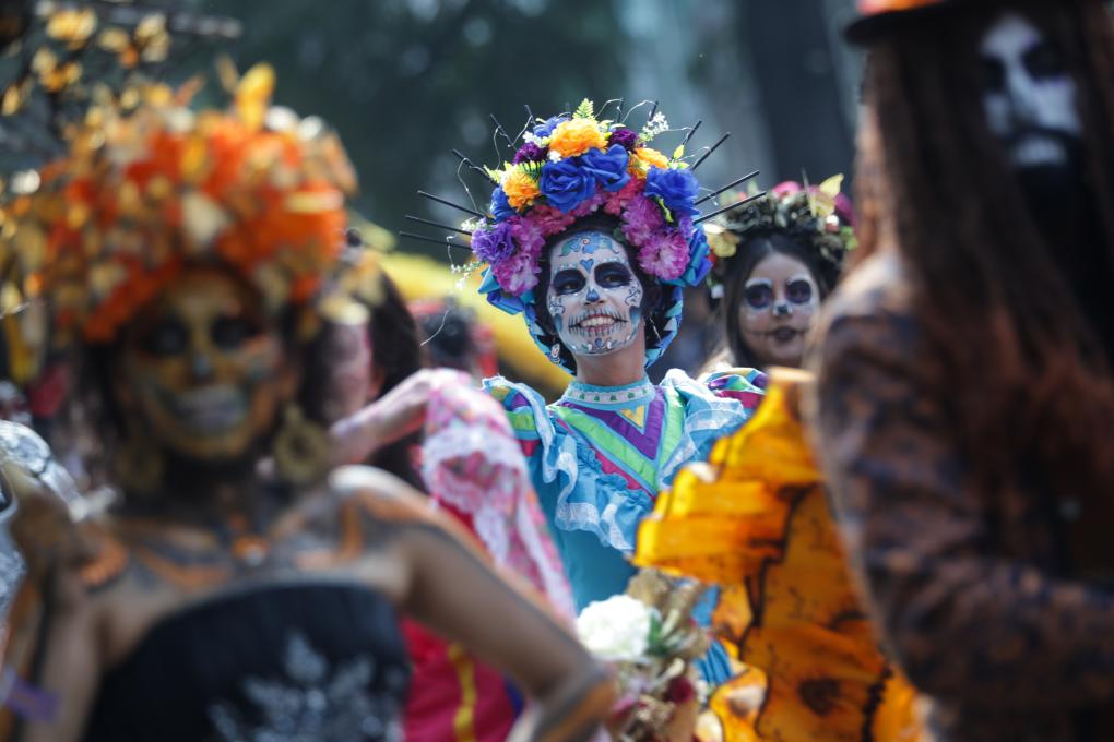 CIUDAD DE MÉXICO, 3 noviembre, 2024 (Xinhua) -- Imagen del 2 de noviembre de 2024 de personas portando disfraces y maquillaje facial mientras participan en el Desfile del Día de Muertos, en el centro de la Ciudad de México, capital de México. (Xinhua/Francisco Cañedo)