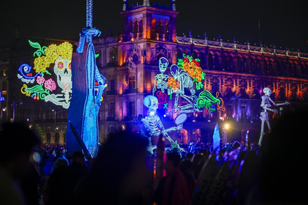 CIUDAD DE MÉXICO, 3 noviembre, 2024 (Xinhua) -- Imagen del 2 de noviembre de 2024 de esculturas de esqueletos gigantes vistas en la Plaza de la Constitución mientras las personas celebran el Día de Muertos, en la Ciudad de México, capital de México. El Día de Muertos de México es una celebración vibrante donde las familias honran y recuerdan a sus seres queridos fallecidos. (Xinhua/Li Muzi)