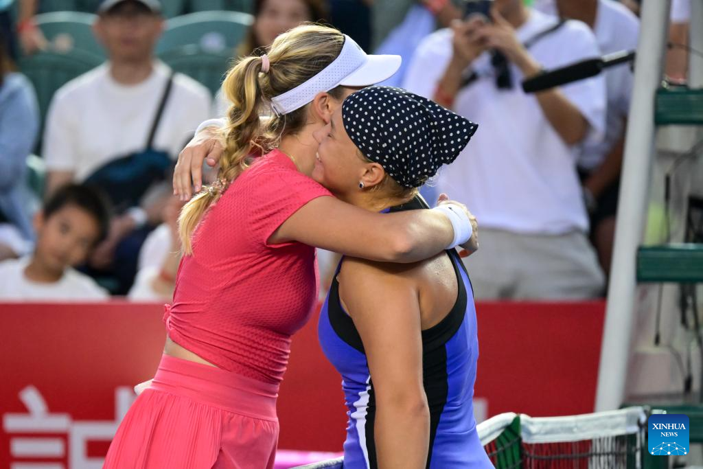 HONG KONG, 3 noviembre, 2024 (Xinhua) -- Diana Shnaider (d), de Rusia, abraza a Katie Boulter, de Reino Unido, después del partido final de individuales femeninos en el Abierto de Tenis de Hong Kong de la WTA250, en Hong Kong, en el sur de China, el 3 de noviembre de 2024. (Xinhua/Zhu Wei)