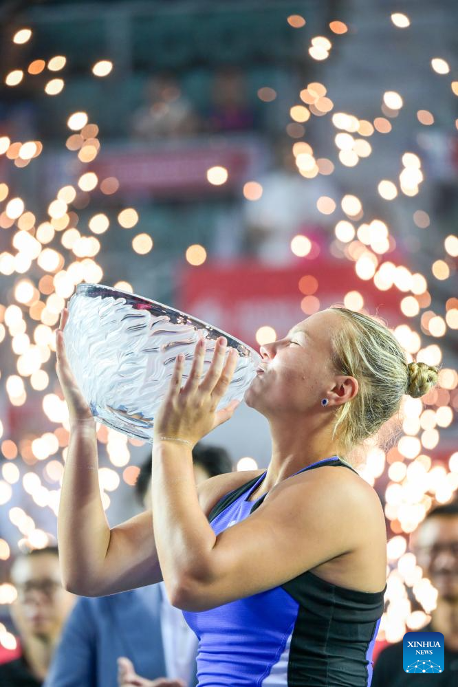HONG KONG, 3 noviembre, 2024 (Xinhua) -- Diana Shnaider besa el trofeo después de ganar el partido final de individuales femeninos entre Diana Shnaider, de Rusia, y Katie Boulter, de Reino Unido, en el Abierto de Tenis de Hong Kong de la WTA250, en Hong Kong, en el sur de China, el 3 de noviembre de 2024. (Xinhua/Zhu Wei)