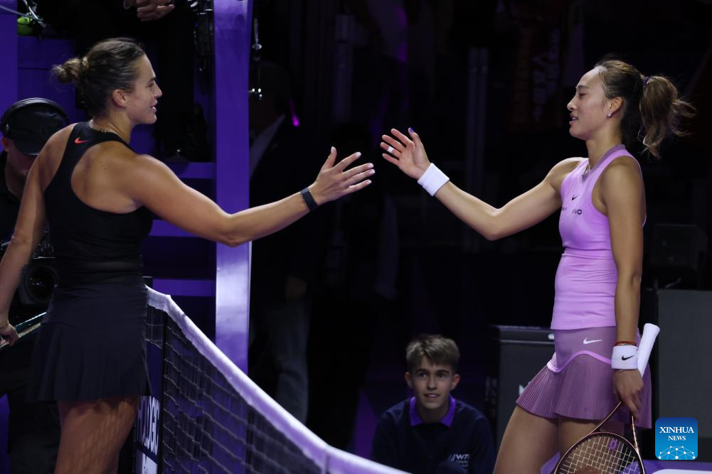RIAD, 3 noviembre, 2024 (Xinhua) -- Imagen del 2 de noviembre de 2024 de Aryna Sabalenka (i), de Bielorrusia y Zheng Qinwen, de China, estrechando sus manos al término de su partido de round robin en el torneo de tenis de las Finales de la WTA, en Riad, Arabia Saudita. (Xinhua/Wang Haizhou)
