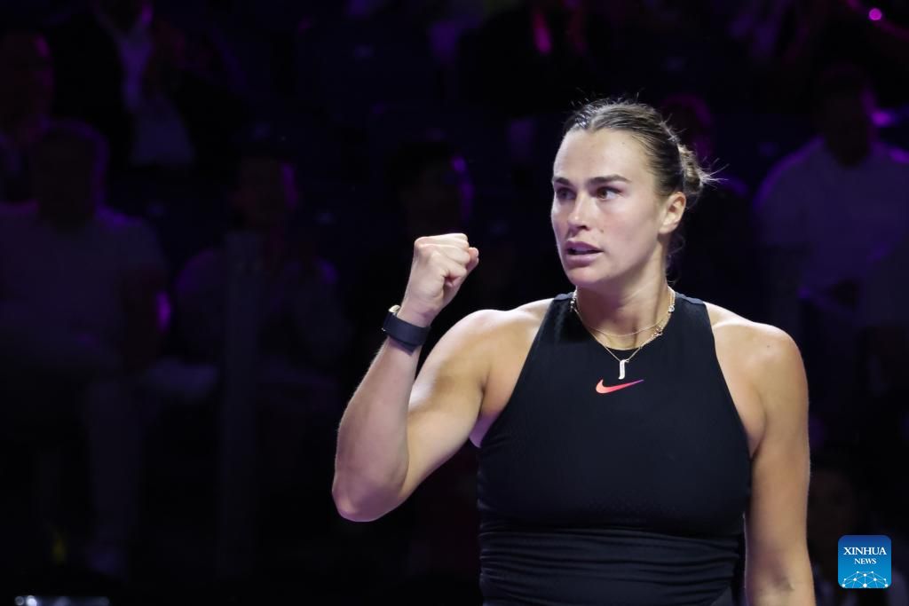 RIAD, 3 noviembre, 2024 (Xinhua) -- Imagen del 2 de noviembre de 2024 de Aryna Sabalenka, de Bielorrusia, reaccionando durante el partido de round robin ante Zheng Qinwen, de China, en el torneo de tenis de las Finales de la WTA, en Riad, Arabia Saudita. (Xinhua/Wang Haizhou)