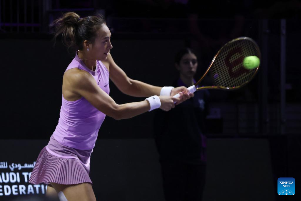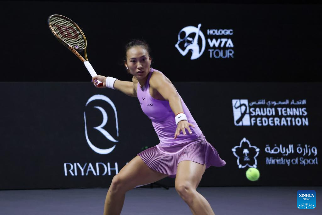 RIAD, 3 noviembre, 2024 (Xinhua) -- Imagen del 2 de noviembre de 2024 de Zheng Qinwen, de China, devolviendo la pelota durante el partido de round robin ante Aryna Sabalenka, de Bielorrusia, en el torneo de tenis de las Finales de la WTA, en Riad, Arabia Saudita. (Xinhua/Wang Haizhou)