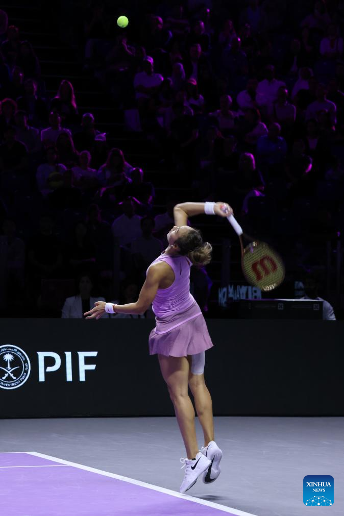 RIAD, 3 noviembre, 2024 (Xinhua) -- Imagen del 2 de noviembre de 2024 de Zheng Qinwen, de China, sirviendo la pelota durante el partido de round robin ante Aryna Sabalenka, de Bielorrusia, en el torneo de tenis de las Finales de la WTA, en Riad, Arabia Saudita. (Xinhua/Wang Haizhou)