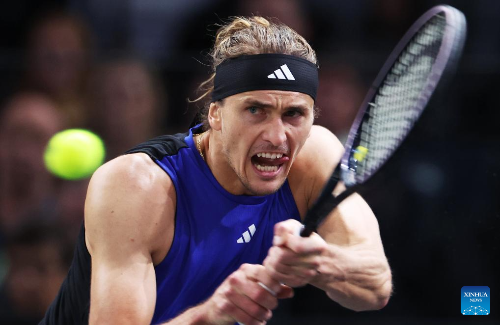 PARIS, 4 noviembre, 2024 (Xinhua) -- Imagen del 3 de noviembre de 2024 de Alexander Zverev compitiendo durante el partido final de individuales masculinos entre Alexander Zverev, de Alemania, y Ugo Humbert, de Francia, en el torneo de tenis Masters 1000 de París de la ATP, en París, Francia. Alexander Zverev se adjudicó el título. (Xinhua/Gao Jing)