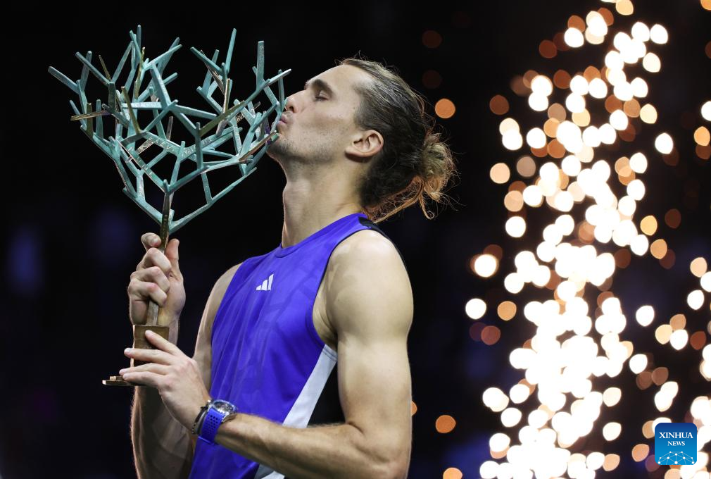 PARIS, 4 noviembre, 2024 (Xinhua) -- Imagen del 3 de noviembre de 2024 de Alexander Zverev besando el trofeo al término del partido final de individuales masculinos entre Alexander Zverev, de Alemania, y Ugo Humbert, de Francia, en el torneo de tenis Masters 1000 de París de la ATP, en París, Francia. Alexander Zverev se adjudicó el título. (Xinhua/Gao Jing)