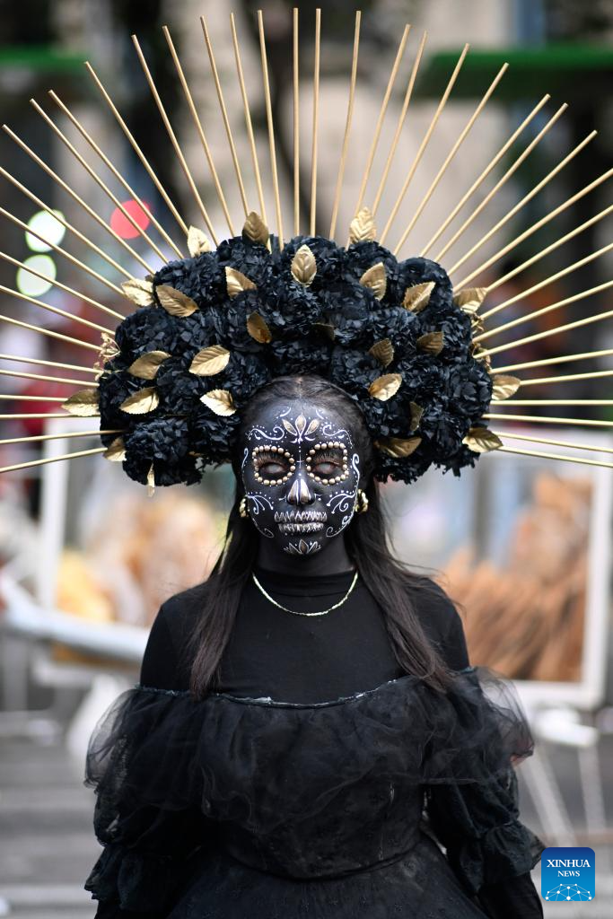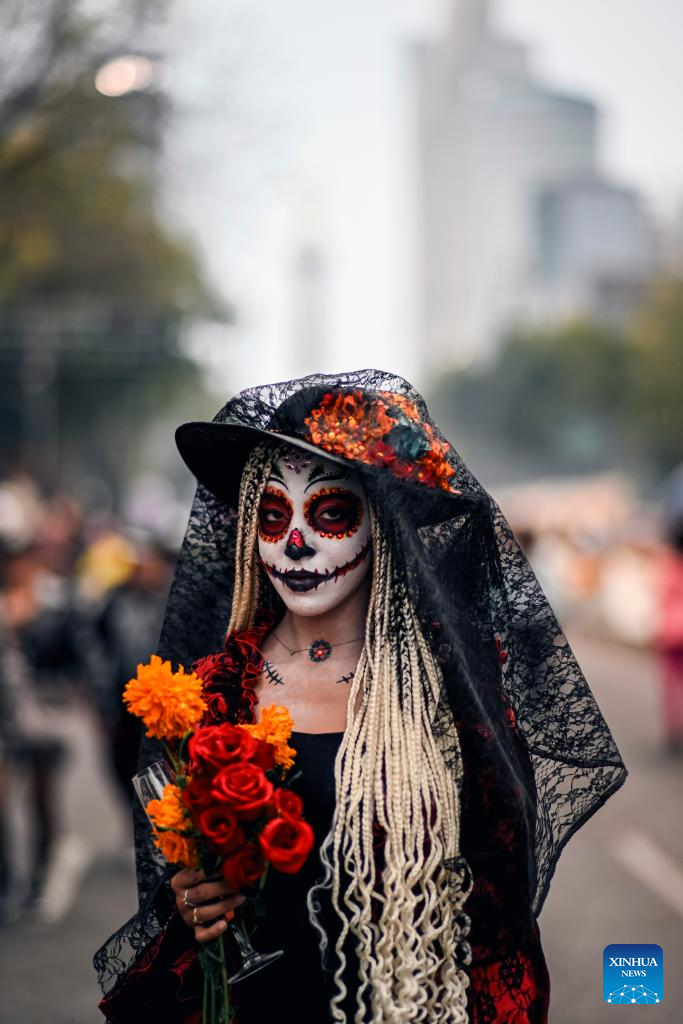 CIUDAD DE MÉXICO, 3 noviembre, 2024 (Xinhua) -- Imagen del 2 de noviembre de 2024 de una mujer disfrazada posando para fotografías, en el centro de la Ciudad de México, capital de México. El Día de Muertos de México es una celebración vibrante donde las familias honran y recuerdan a sus seres queridos fallecidos. (Xinhua/Li Muzi)