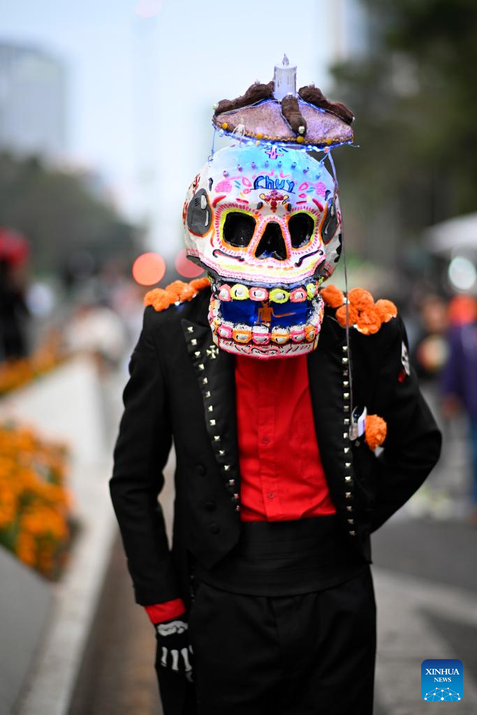 CIUDAD DE MÉXICO, 3 noviembre, 2024 (Xinhua) -- Imagen del 2 de noviembre de 2024 de un hombre disfrazado posando para fotografías, en el centro de la Ciudad de México, capital de México. El Día de Muertos de México es una celebración vibrante donde las familias honran y recuerdan a sus seres queridos fallecidos. (Xinhua/Li Muzi)
