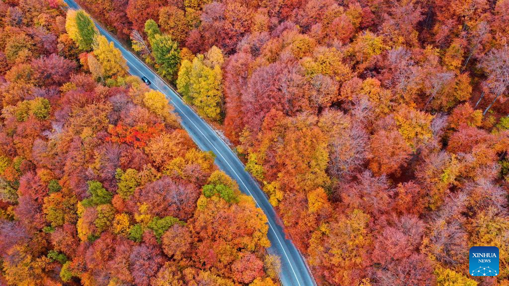 MAVROVO, 4 noviembre, 2024 (Xinhua) -- Vista aérea tomada con un dron el 3 de noviembre de 2024 de un vehículo circulando por una carretera en el Parque Nacional de Mavrovo, en Mavrovo, Macedonia del Norte. (Xinhua/Tomislav Georgiev)