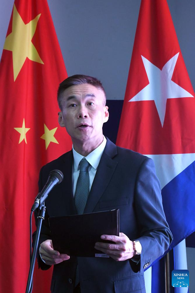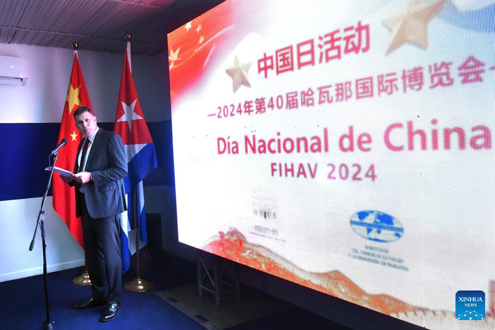 Imagen del 4 de noviembre de 2024 del embajador de China en Cuba, Hua Xin, pronunciando un discurso en la celebración del Día de la República Popular China durante la 40ª edición de la Feria Internacional de La Habana (FIHAV 2024) en el recinto ferial Expocuba, en La Habana, capital de Cuba. Los gobiernos de Cuba y China ratificaron la víspera su voluntad de continuar estrechando sus vínculos económicos durante la celebración del Día de la República Popular China en la 40ª edición de la FIHAV 2024. (Xinhua/Joaquín Hernández)