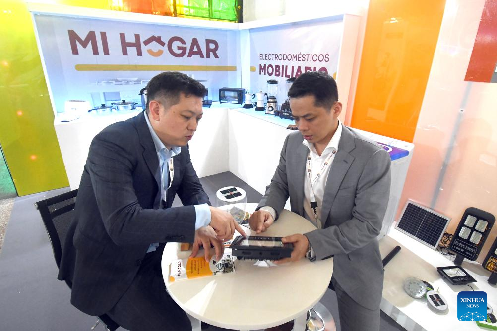 Imagen del 4 de noviembre de 2024 de dos expositores chinos conversando en el estand de China durante la 40ª edición de la Feria Internacional de La Habana (FIHAV 2024) en el recinto ferial Expocuba, en La Habana, capital de Cuba. Los gobiernos de Cuba y China ratificaron la víspera su voluntad de continuar estrechando sus vínculos económicos durante la celebración del Día de la República Popular China en la 40ª edición de la FIHAV 2024. (Xinhua/Joaquín Hernández)