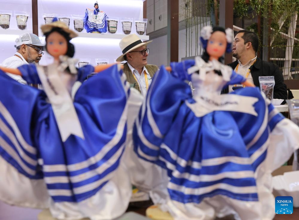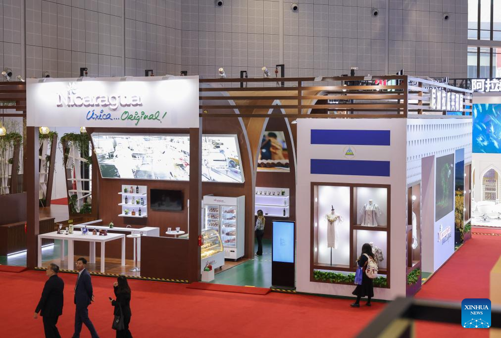 SHANGHAI, 5 noviembre, 2024 (Xinhua) -- Imagen del 5 de noviembre de 2024 del pabellón de Nicaragua durante la VII Exposición Internacional de Importaciones de China (CIIE, por siglas en inglés), en Shanghai, en el este de China. Una nueva edición de la CIIE, la primera de su tipo en el mundo dedicada a las importaciones, abrió sus puertas el martes en Shanghai. Francia, Malasia, Nicaragua, Arabia Saudita, Tanzania y Uzbekistán son los países invitados de honor en la VII CIIE. (Xinhua/Yin Gang)