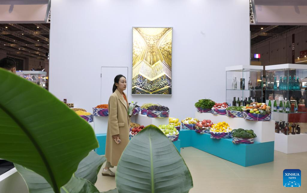 SHANGHAI, 5 noviembre, 2024 (Xinhua) -- Una mujer visita el pabellón de Uzbekistán durante la VII Exposición Internacional de Importaciones de China (CIIE, por siglas en inglés), en Shanghai, en el este de China, el 5 de noviembre de 2024. Una nueva edición de la CIIE, la primera de su tipo en el mundo dedicada a las importaciones, abrió sus puertas el martes en Shanghai. Francia, Malasia, Nicaragua, Arabia Saudita, Tanzania y Uzbekistán son los países invitados de honor en la VII CIIE. (Xinhua/Yin Gang)