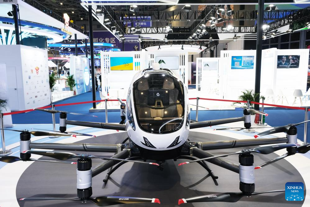 SHANGHAI, 5 noviembre, 2024 (Xinhua) -- Un avión eléctrico de despegue y aterrizaje vertical es exhibido durante la VII Exposición Internacional de Importaciones de China (CIIE, por sus siglas en inglés), en Shanghai, en el este de China, el 5 de noviembre de 2024. Una nueva edición de la CIIE, la primera de su tipo en el mundo dedicada a las importaciones, abrió sus puertas el martes en Shanghai. (Xinhua/Zhou Xinyi)