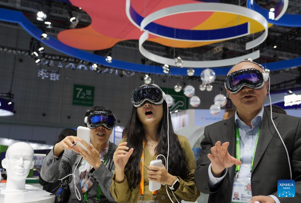 SHANGHAI, 5 noviembre, 2024 (Xinhua) -- Visitantes experimentan el proceso de terapia con radioligandos usando tecnología de Realidad Aumentada en el estand de Novartis durante la VII Exposición Internacional de Importaciones de China (CIIE, por sus siglas en inglés), en Shanghai, en el este de China, el 5 de noviembre de 2024. Una nueva edición de la CIIE, la primera de su tipo en el mundo dedicada a las importaciones, abrió sus puertas el martes en Shanghai. (Xinhua/Liu Ying)