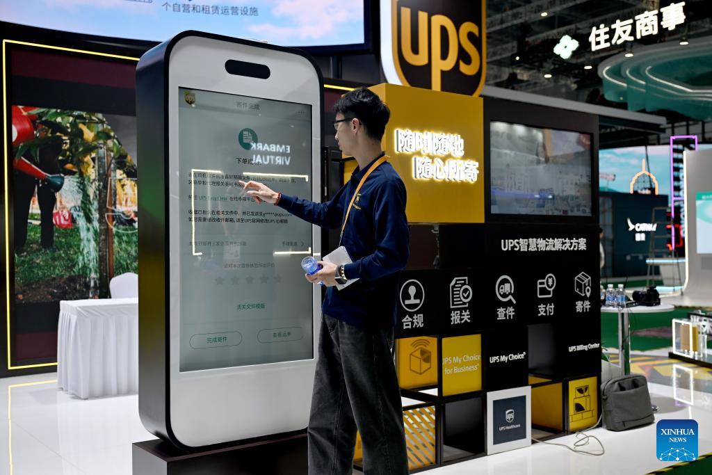 SHANGHAI, 5 noviembre, 2024 (Xinhua) -- Un trabajador muestra soluciones logísticas inteligentes en el estand de UPS durante la VII Exposición Internacional de Importaciones de China (CIIE, por sus siglas en inglés), en Shanghai, en el este de China, el 5 de noviembre de 2024. Una nueva edición de la CIIE, la primera de su tipo en el mundo dedicada a las importaciones, abrió sus puertas el martes en Shanghai. (Xinhua/Chen Haoming)