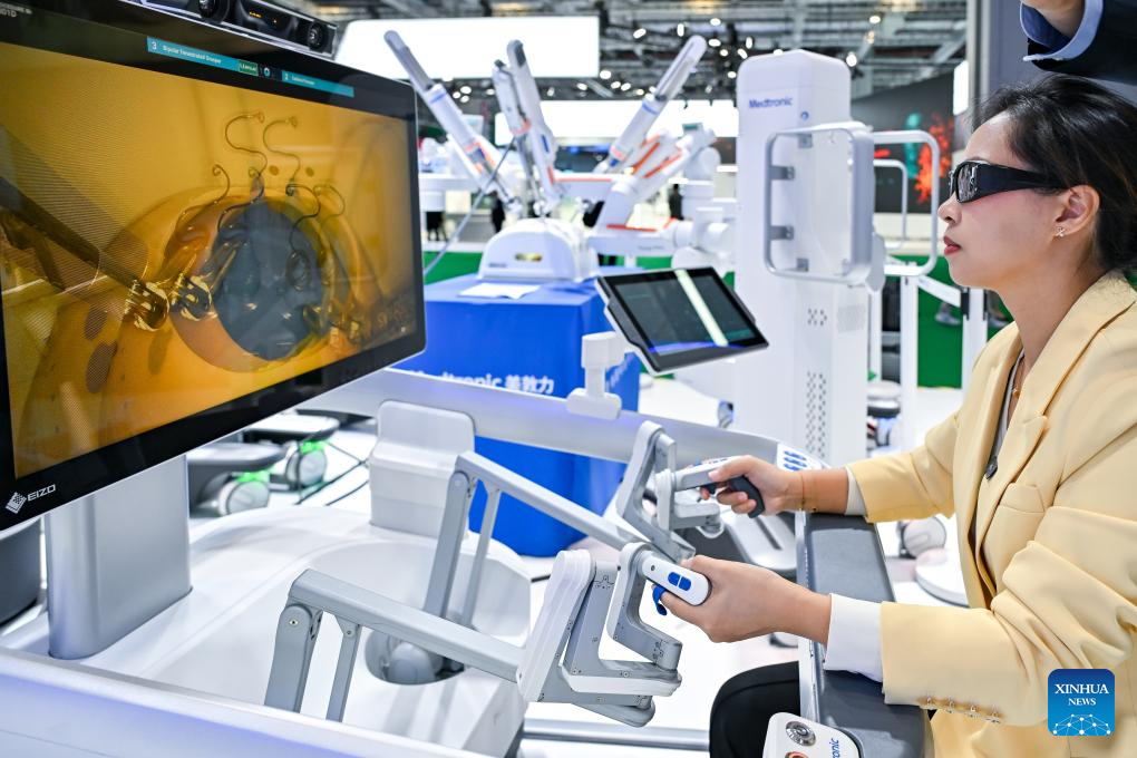 SHANGHAI, 5 noviembre, 2024 (Xinhua) -- Una visitante opera un robot quirúrgico en el área de exposición de Equipo Médico y Productos para el Cuidado de la Salud durante la VII Exposición Internacional de Importaciones de China (CIIE, por sus siglas en inglés), en Shanghai, en el este de China, el 5 de noviembre de 2024. Una nueva edición de la CIIE, la primera de su tipo en el mundo dedicada a las importaciones, abrió sus puertas el martes en Shanghai. (Xinhua/Zhang Cheng)