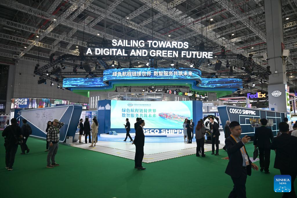 SHANGHAI, 5 noviembre, 2024 (Xinhua) -- Imagen del 5 de noviembre de 2024 del área de exhibición de COSCO Shipping durante la VII Exposición Internacional de Importaciones de China (CIIE, por sus siglas en inglés), en Shanghai, en el este de China. Una nueva edición de la CIIE, la primera de su tipo en el mundo dedicada a las importaciones, abrió sus puertas el martes en Shanghai. (Xinhua/Chen Haoming)