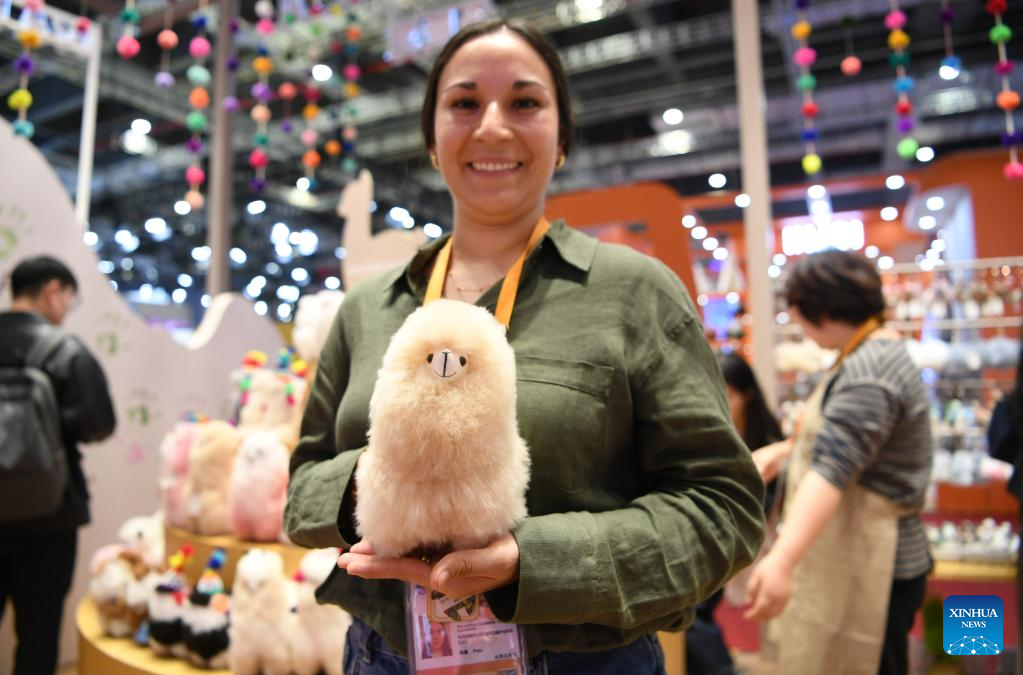 SHANGHAI, 5 noviembre, 2024 (Xinhua) -- Una expositora muestra un juguete de peluche de alpaca en el estand de Warmpaca durante la VII Exposición Internacional de Importaciones de China (CIIE, por sus siglas en inglés), en Shanghai, en el este de China, el 5 de noviembre de 2024. Una nueva edición de la CIIE, la primera de su tipo en el mundo dedicada a las importaciones, abrió sus puertas el martes en Shanghai. (Xinhua/Jin Mamengni)