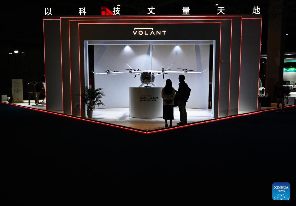 SHANGHAI, 5 noviembre, 2024 (Xinhua) -- Personas observan el modelo de un avión eléctrico de despegue y aterrizaje vertical durante la VII Exposición Internacional de Importaciones de China (CIIE, por sus siglas en inglés), en Shanghai, en el este de China, el 5 de noviembre de 2024. Una nueva edición de la CIIE, la primera de su tipo en el mundo dedicada a las importaciones, abrió sus puertas el martes en Shanghai. (Xinhua/Zhang Keren)