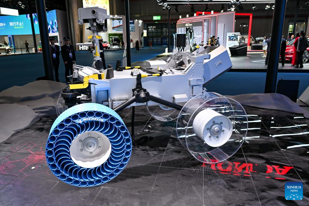 SHANGHAI, 5 noviembre, 2024 (Xinhua) -- Imagen del 5 de noviembre de 2024 del neumático de un vehículo lunar en el área de exposición de Michelin durante la VII Exposición Internacional de Importaciones de China (CIIE, por sus siglas en inglés), en Shanghai, en el este de China. Una nueva edición de la CIIE, la primera de su tipo en el mundo dedicada a las importaciones, abrió sus puertas el martes en Shanghai. (Xinhua/Zhang Cheng)