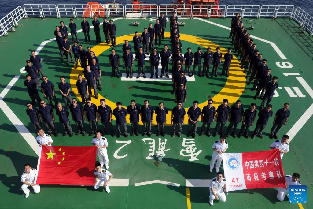 XUELONG 2, 6 noviembre, 2024 (Xinhua) -- Miembros del equipo de la 41ª expedición antártica de China posan para fotografías en formación en el rompehielos Xuelong 2 de China, o Dragón de Nieve 2. Los rompehielos Xuelong y Xuelong 2 de China cruzaron el ecuador y entraron en el hemisferio sur para la 41ª expedición antártica del país el martes y miércoles respectivamente. (Xinhua/Huang Taoming)