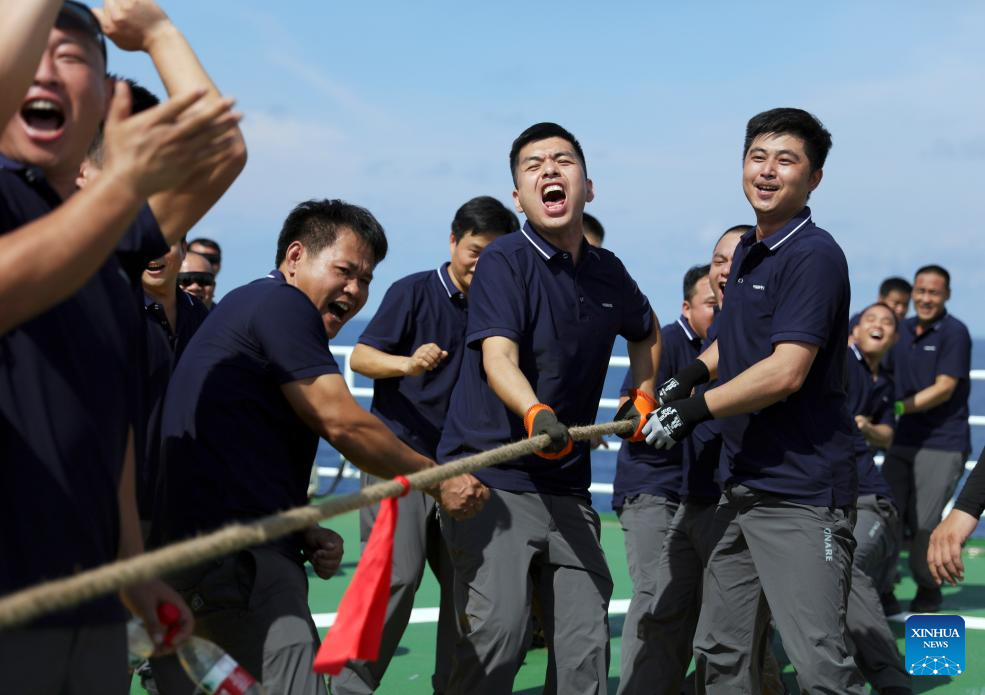 XUELONG 2, 6 noviembre, 2024 (Xinhua) -- Miembros del equipo de la 41ª expedición antártica de China participan en un juego de tira y afloja en el rompehielos Xuelong 2 de China, o Dragón de Nieve 2. Los rompehielos Xuelong y Xuelong 2 de China cruzaron el ecuador y entraron en el hemisferio sur para la 41ª expedición antártica del país el martes y miércoles respectivamente. (Xinhua/Huang Taoming)