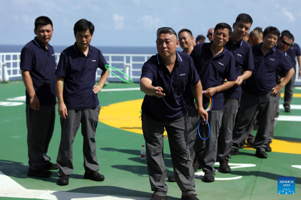 XUELONG 2, 6 noviembre, 2024 (Xinhua) -- Miembros del equipo de la 41ª expedición antártica de China asisten a un juego de lanzamiento de aros en el rompehielos Xuelong 2 de China, o Dragón de Nieve 2. Los rompehielos Xuelong y Xuelong 2 de China cruzaron el ecuador y entraron en el hemisferio sur para la 41ª expedición antártica del país el martes y miércoles respectivamente. (Xinhua/Huang Taoming)