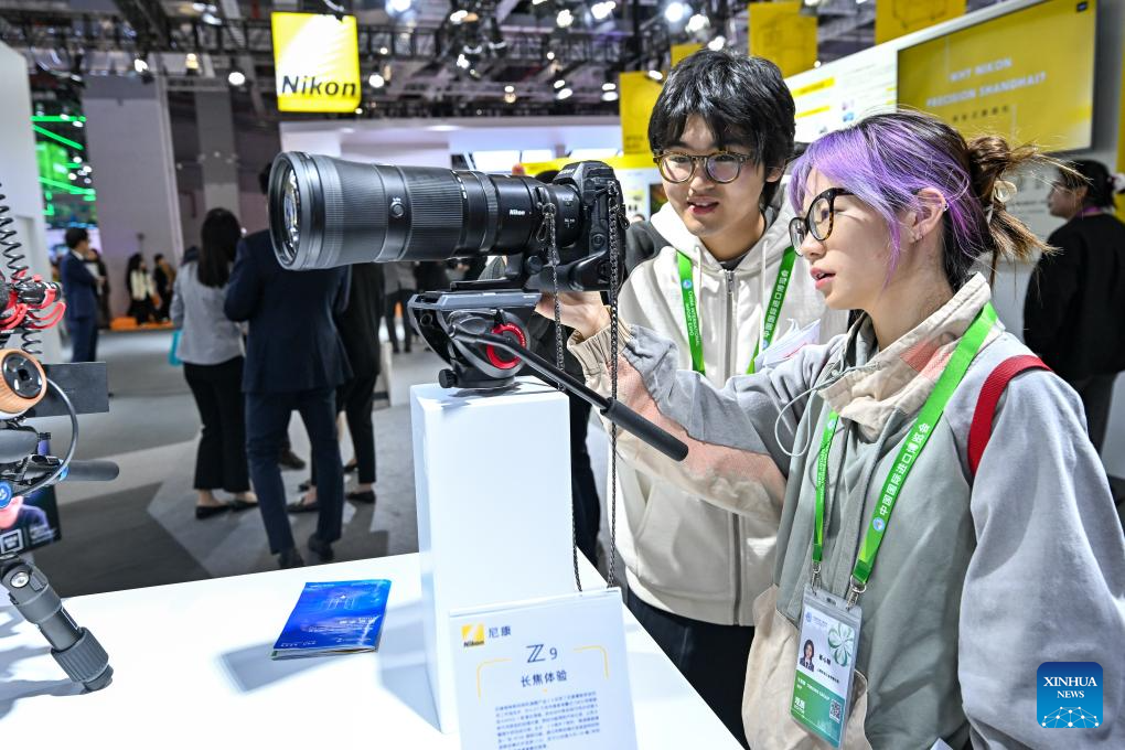 SHANGHAI, 6 noviembre, 2024 (Xinhua) -- Visitantes experimentan con equipo fotográfico en el estand de Nikon en el área de exposición de Industria Inteligente y Tecnología de la Información durante la VII Exposición Internacional de Importaciones de China (CIIE, por siglas en inglés), en Shanghai, en el este de China, el 6 de noviembre de 2024. La actual CIIE exhibe tecnología de vanguardia y equipos de alta gama, proporcionando una plataforma de comunicación para el sector de nuevos materiales. (Xinhua/Zhang Cheng)
